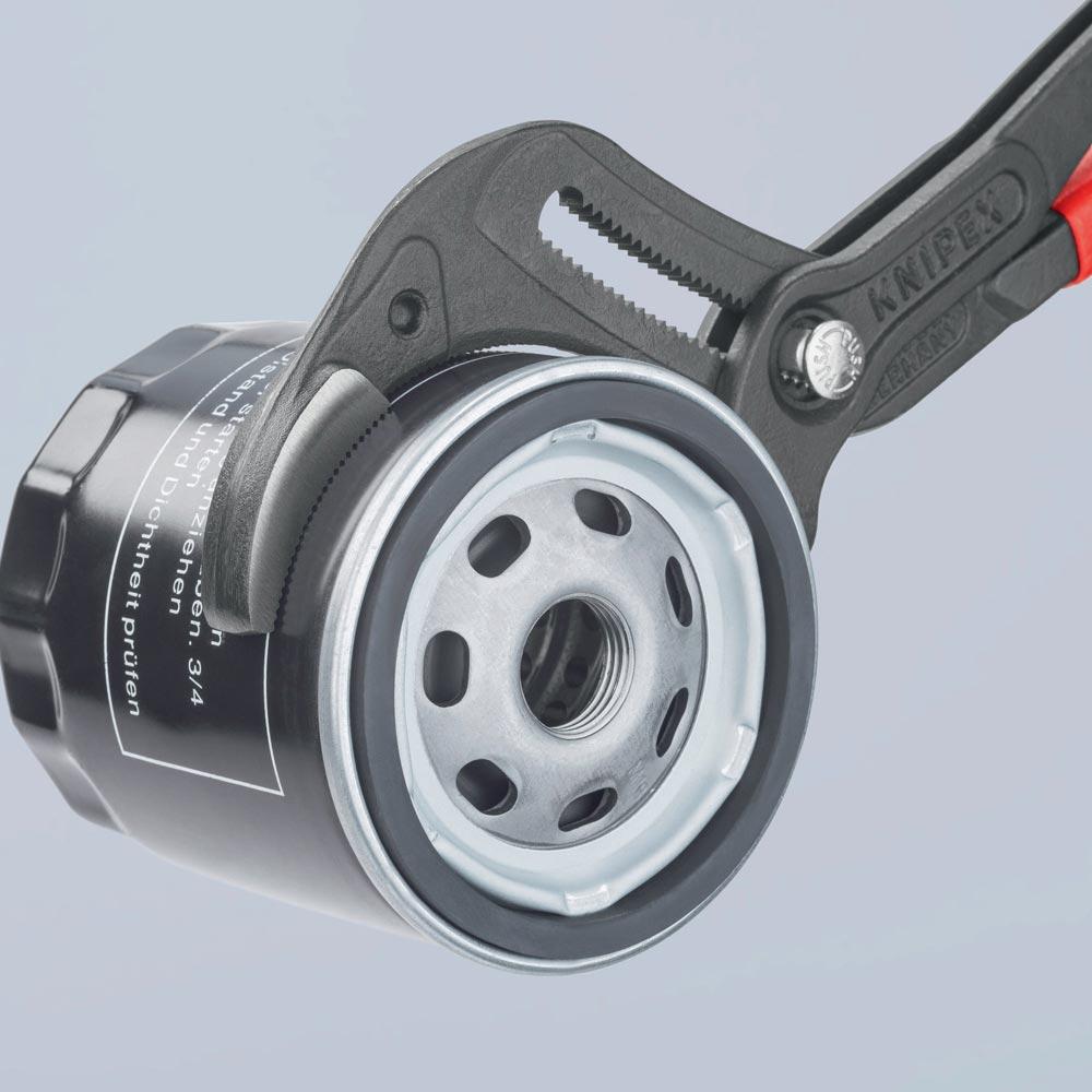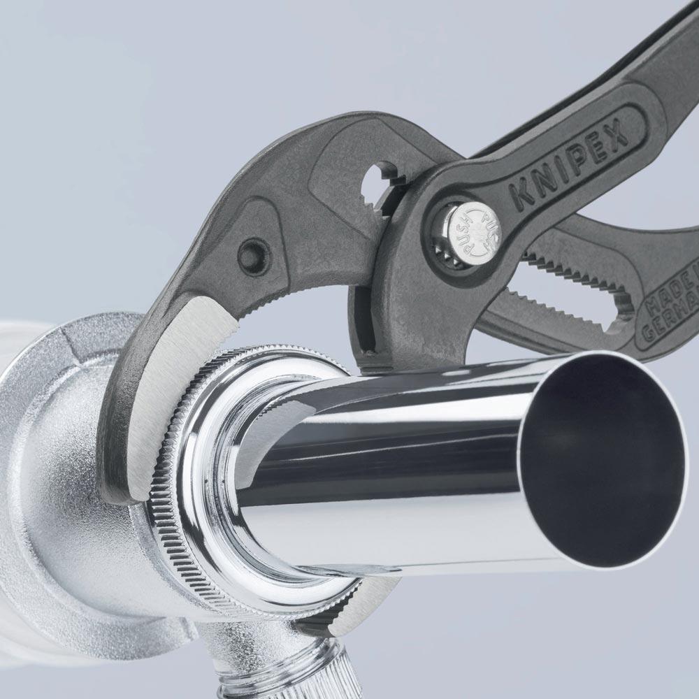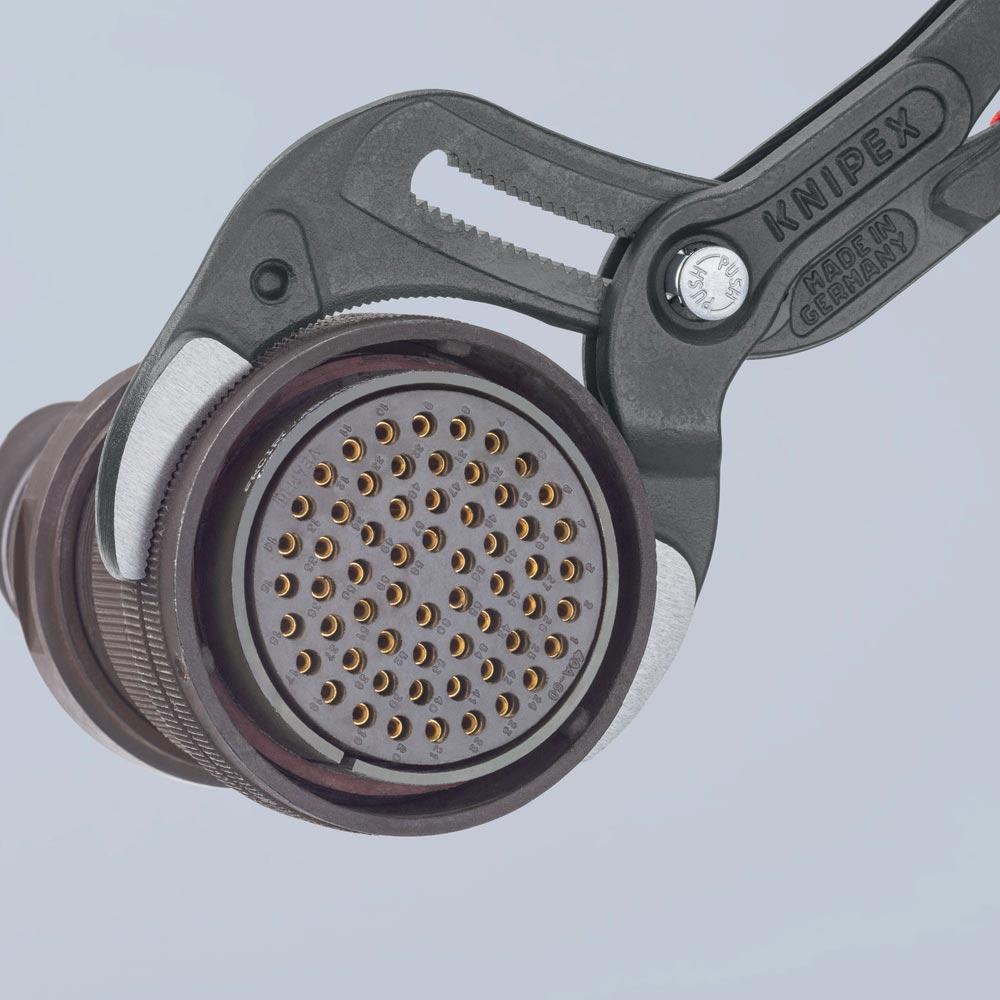 25-fach verstellbares, durchgestecktes Gelenk · Druckknopfverstellung · ergonomische Schenkelgeometrie · zum Anziehen und Lösen von Siphon-Verschraubungen, Kunststoff-Rohrverbindungen und runden Überwurfmuttern · Chrom-Vanadin-Elektrostahl, geschmiedet, ölgehärtet