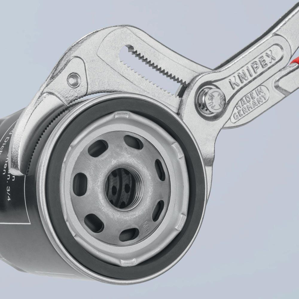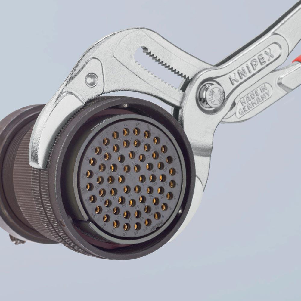 25-fach verstellbares, durchgestecktes Gelenk · Druckknopfverstellung · ergonomische Schenkelgeometrie · zum Anziehen und Lösen von Siphon-Verschraubungen, Kunststoff-Rohrverbindungen und runden Überwurfmuttern · Chrom-Vanadin-Elektrostahl, geschmiedet, ölgehärtet