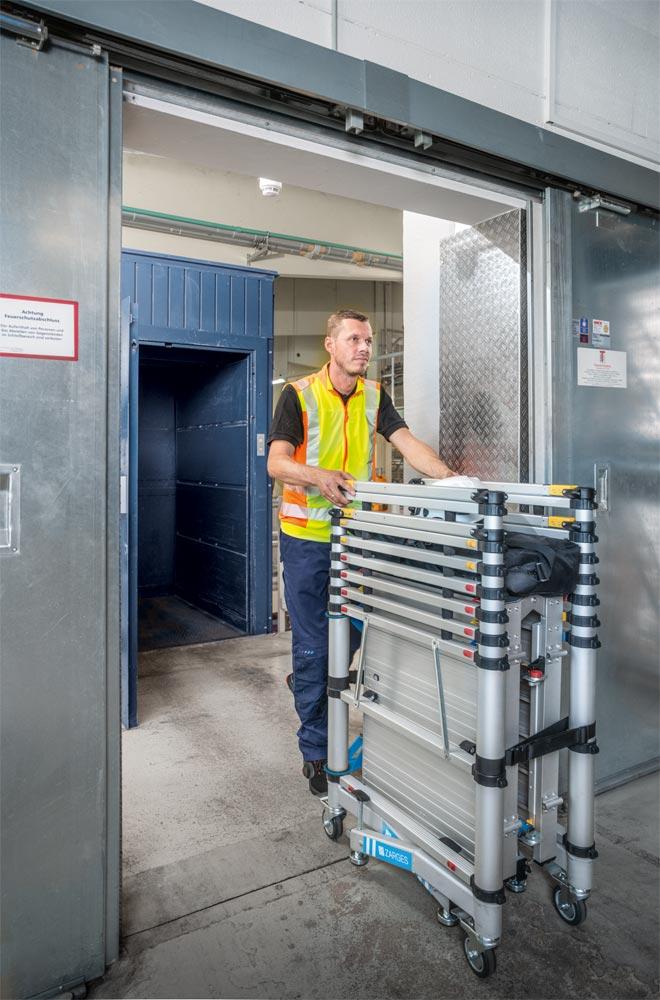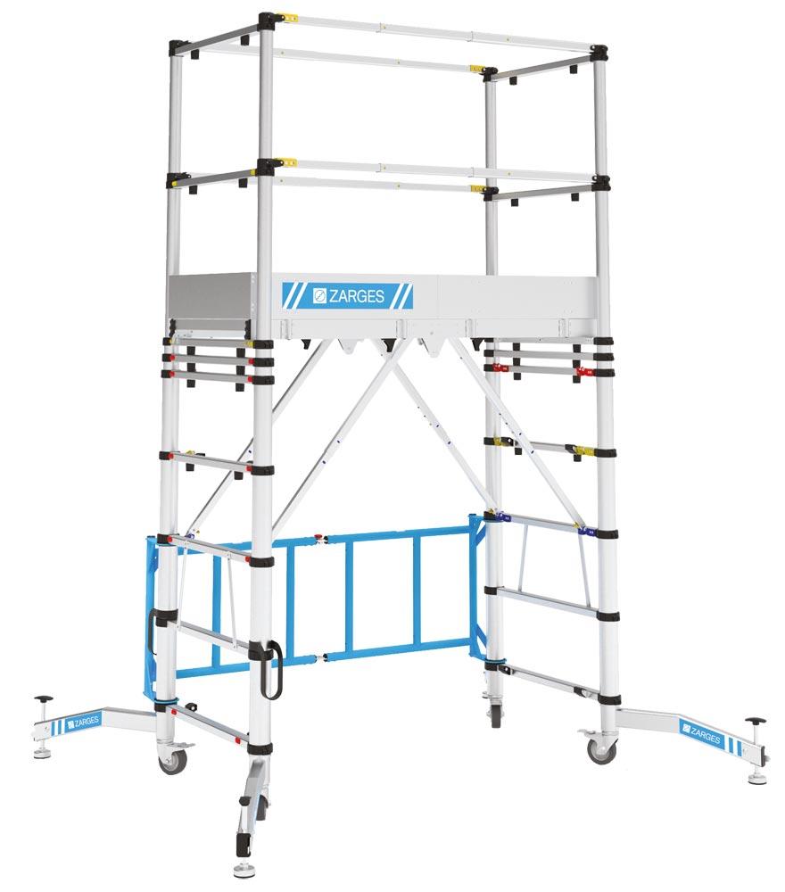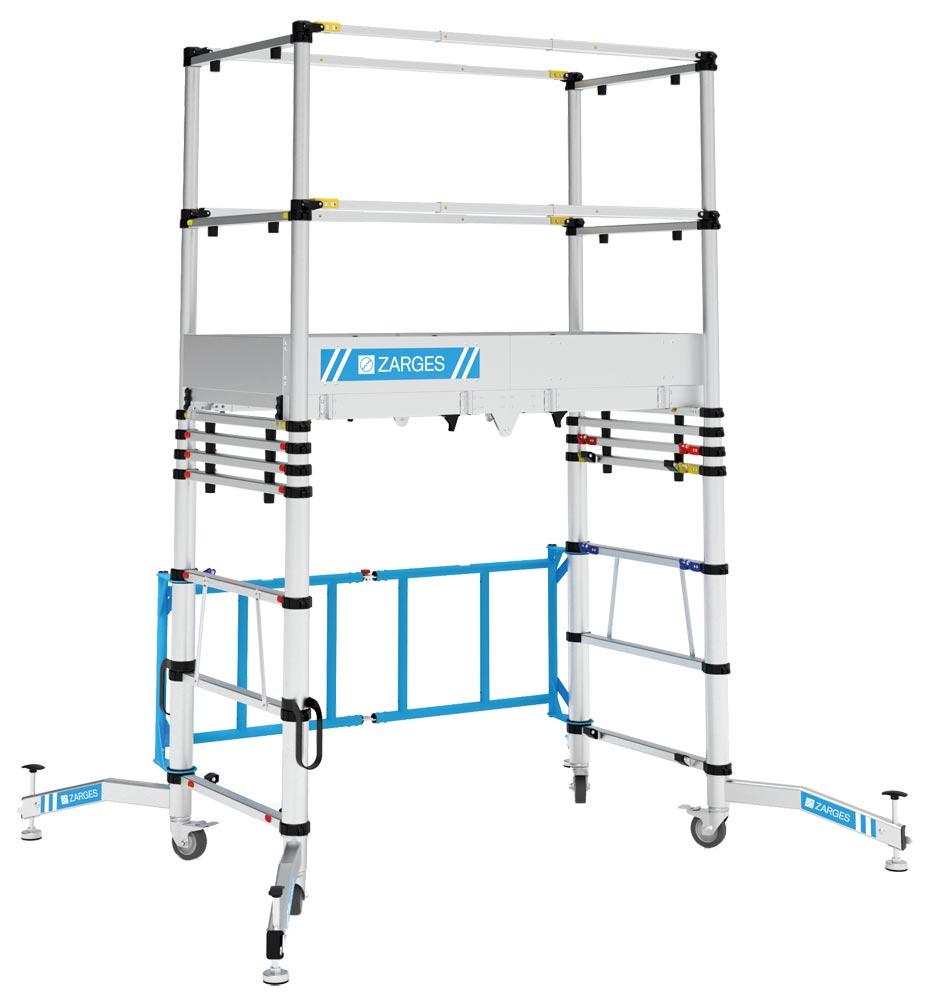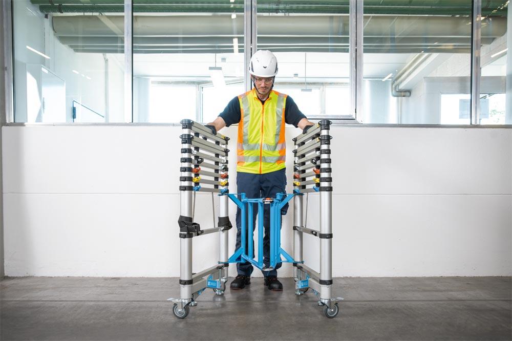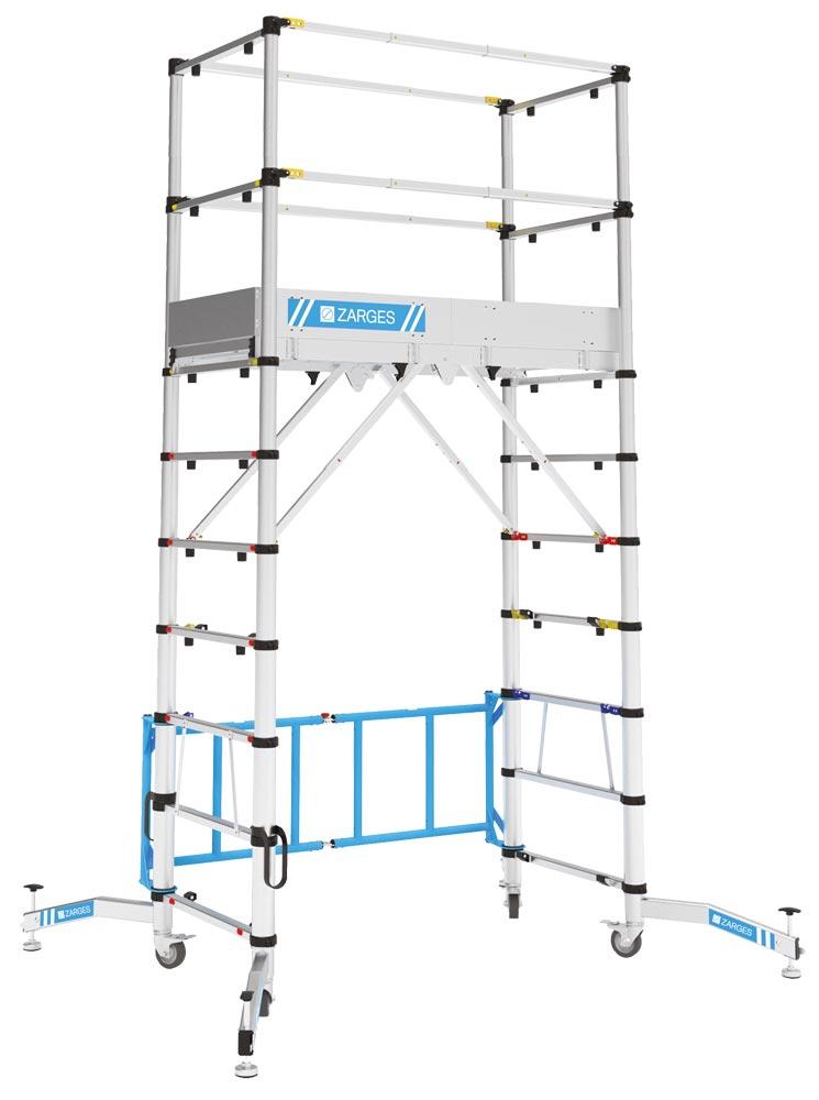 Fahrgerüst mit innovativen Teleskop-Mechanismus für schnellen Auf- und Abbau ∙ Große Aluminium-Plattform mit Durchstieg ∙ Leicht zu transportieren - auch in einem kleinen Transporter bzw. PkW-Kofferraum ∙ Durch eine Person bedienbar ∙ Integrierte Ausleger mit Einrastpositionen für freien sowie wandnahen Stand ∙ Lenkrollen mit Bremsfunktion.