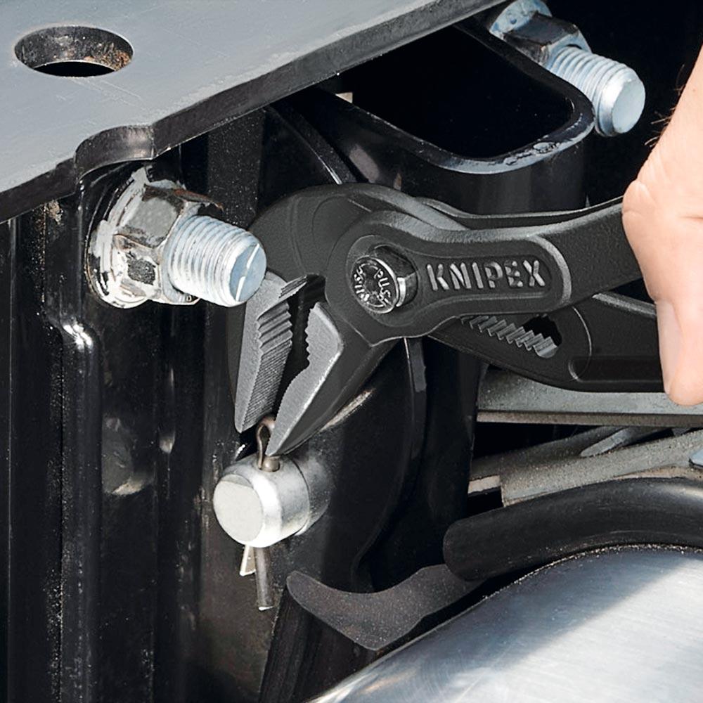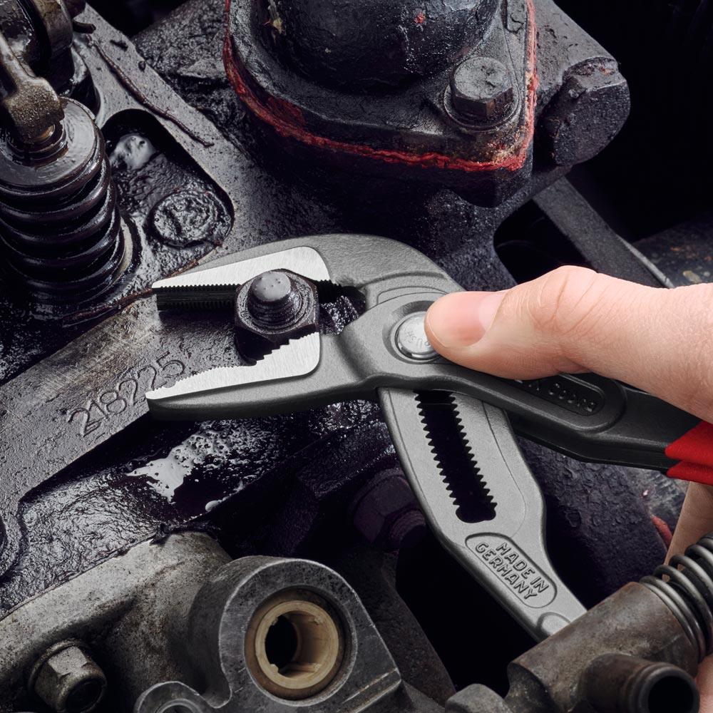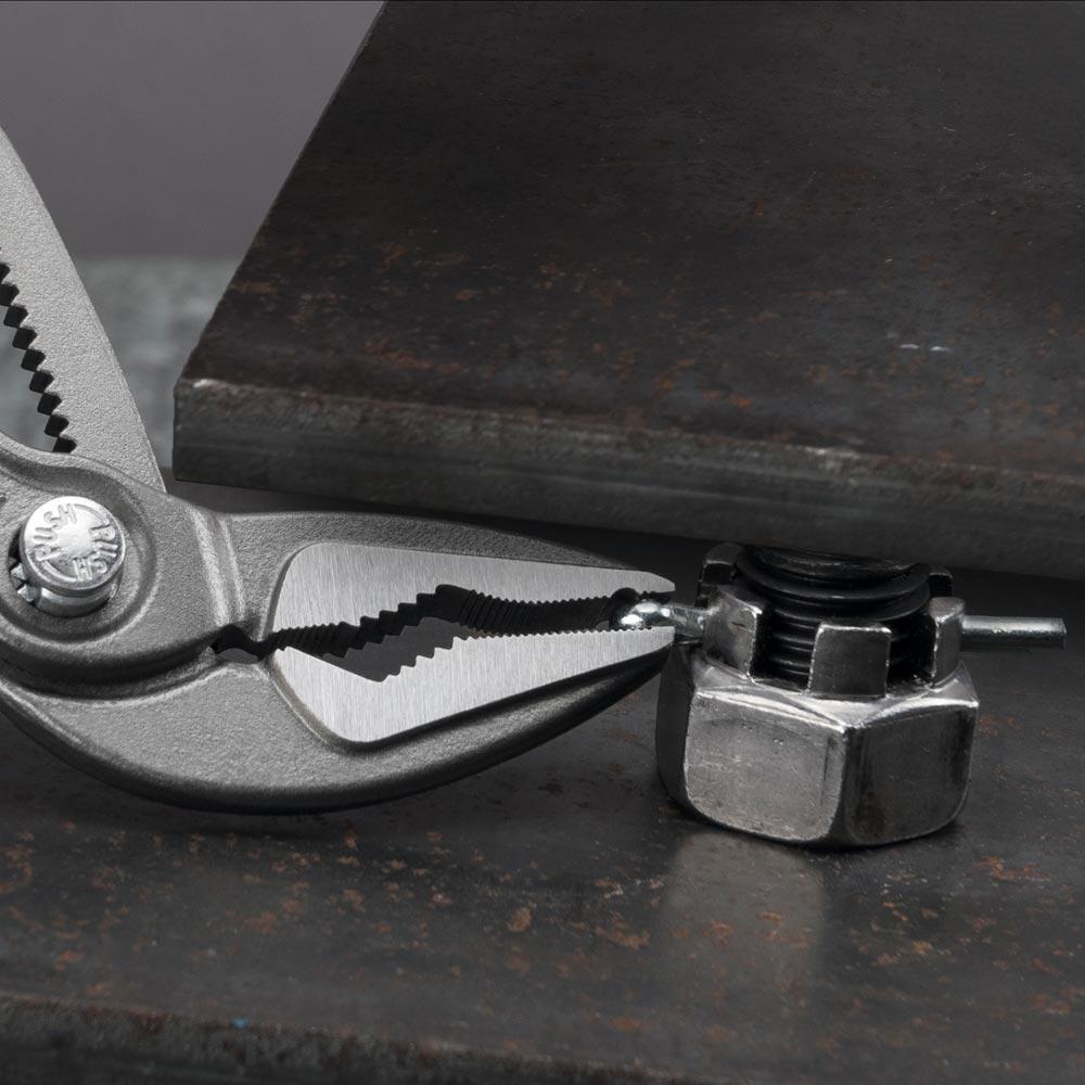 selbstklemmend an Rohren und Muttern · durchgestecktes Gelenk · Einstellung per Knopfdruck direkt am Werkstück · besonders guter Zugang zum Werkstück durch sehr schlanke Bauform im gesamten Kopf- und Gelenkbereich · ideal für Service und Instandhaltung, Gerätereparatur, Fahrzeugbau und Industrie · Klemmschutz · Chrom-Vanadin-Elektrostahl, geschmiedet, mehrstufig ölgehärtet