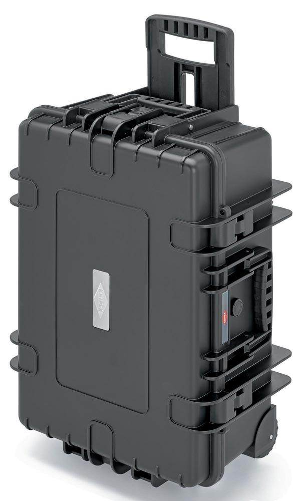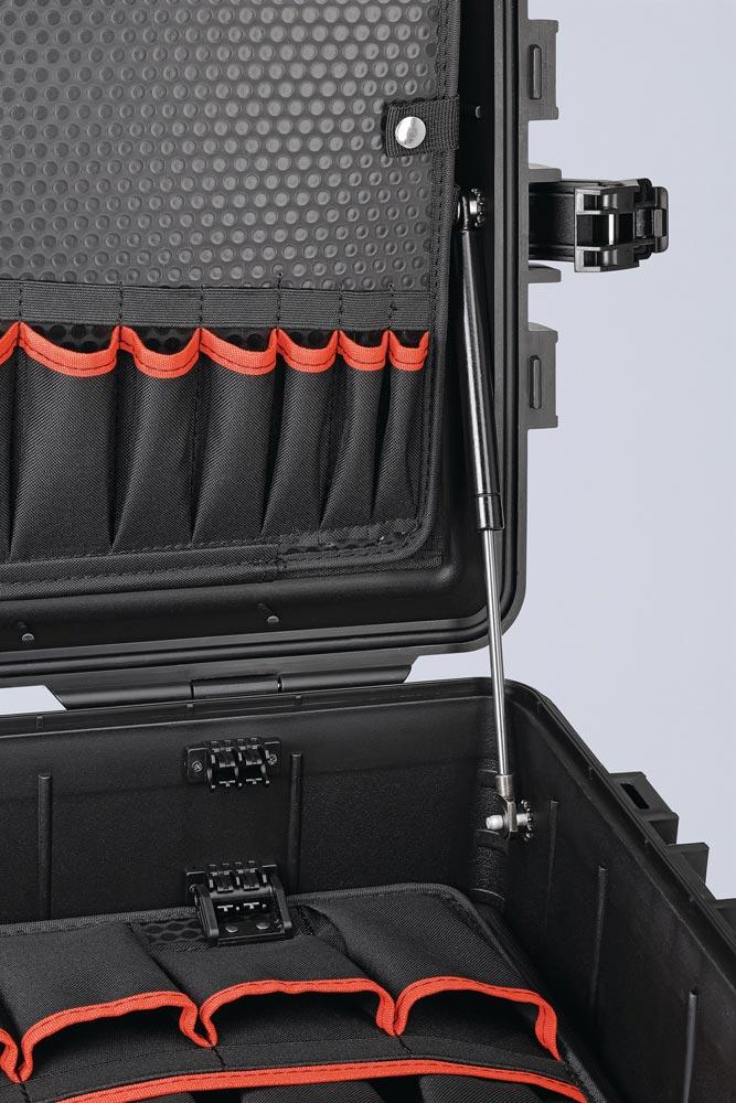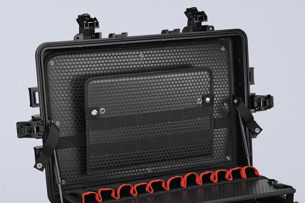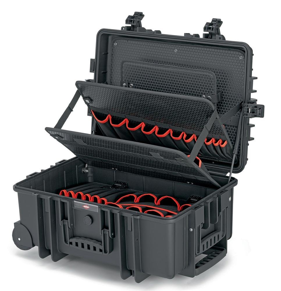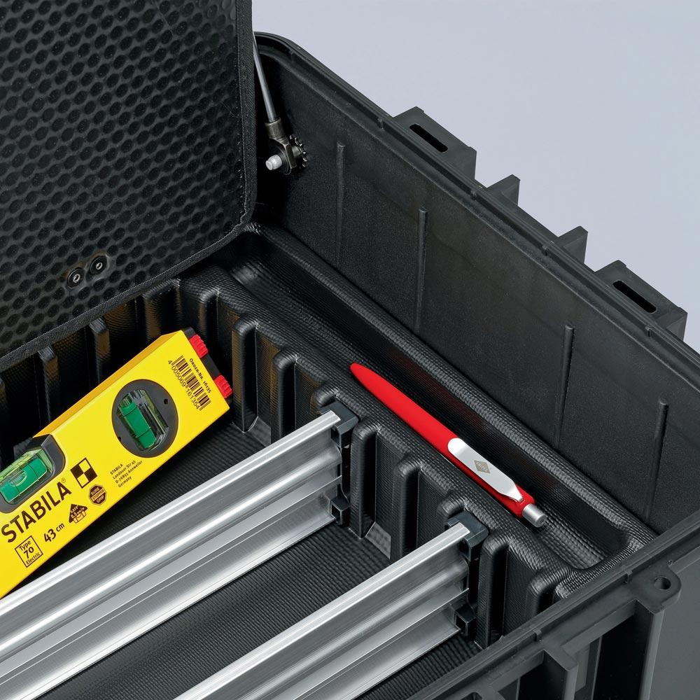 Staub- und wasserdicht · flugtauglich · aus schlagfestem Polypropylen · automatisches Druckausgleichventil · Temperaturstabil von - 30°C bis + 80°C · Vorrichtung für Vorhängeschloss (gehört nicht zum Lieferumfang) · Dokumentenfach · Werkzeugtafeln aus Con-Pearl® mit 54 bestückbaren Werkzeugtaschen und 94 Werkzeugschlaufen · verschließbare Bodenschale (individuell unterteilbar durch Aluminium-Trennstegesystem) · Zweikomponenten-Griff · integriertes Fahrgestell mit zwei leicht laufenden Rollen und Teleskopgriff · Volumen 45 Liter · max. belastbar bis 35 kg