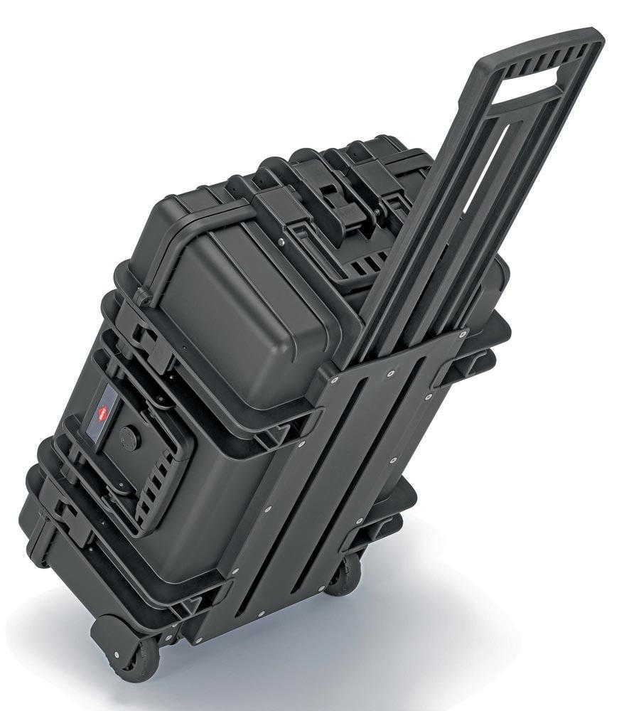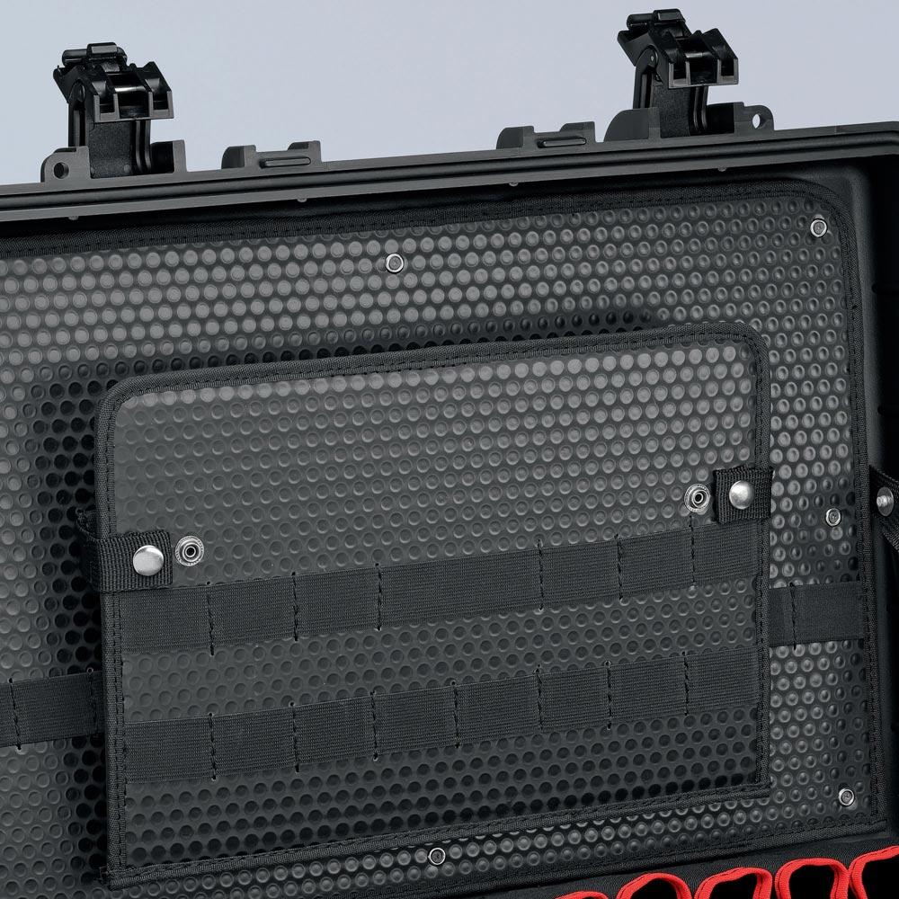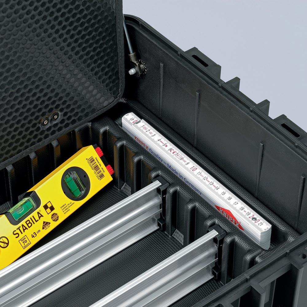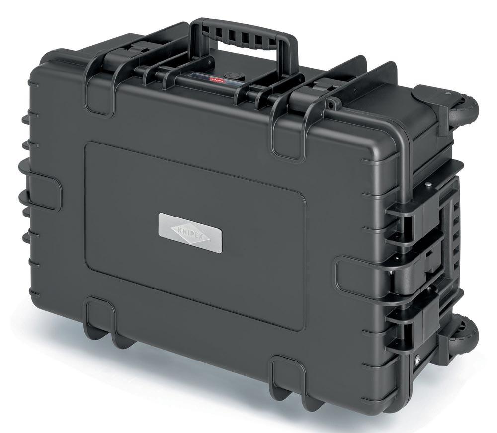Staub- und wasserdicht · flugtauglich · aus schlagfestem Polypropylen · automatisches Druckausgleichventil · Temperaturstabil von - 30°C bis + 80°C · Vorrichtung für Vorhängeschloss (gehört nicht zum Lieferumfang) · Dokumentenfach · Werkzeugtafeln aus Con-Pearl® mit 54 bestückbaren Werkzeugtaschen und 94 Werkzeugschlaufen · verschließbare Bodenschale (individuell unterteilbar durch Aluminium-Trennstegesystem) · Zweikomponenten-Griff · integriertes Fahrgestell mit zwei leicht laufenden Rollen und Teleskopgriff · Volumen 45 Liter · max. belastbar bis 35 kg