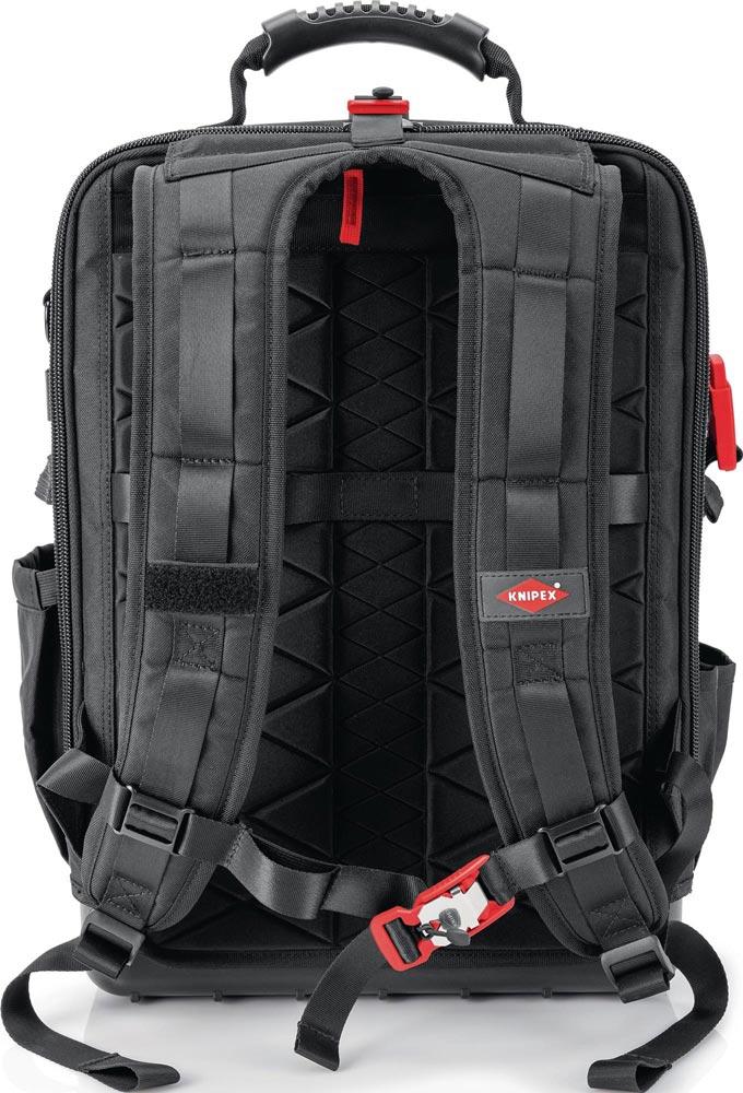 aus nachhaltigen Recycling-Kunstfasern · komplett aufklappbare Vorder- und Rückseite · herausnehmbare Werkzeugtafel und ergonomischer Rückenpolsterung · 2 separate Innenfächern für Werkzeug, Messgeräte, Notebook oder Tablet · innen 1 und außen 4 MOLLE-Bänder zur Befestigung von beliebigen Adaptern, Karabinern, Zubehör je nach Bedarf · 21 Haltelaschen und 37 Taschen, teilweise mit Reißverschlüssen · mit Kofferlasche zur Fixierung an Teleskopgriffen von Werkzeugkoffern · Leergewicht 2,9 kg · geprüfte Belastbarkeit bis 15 kg Werkzeuggewicht