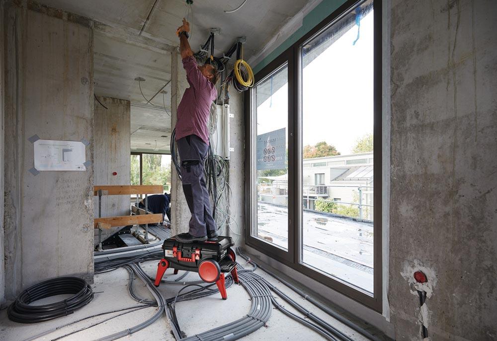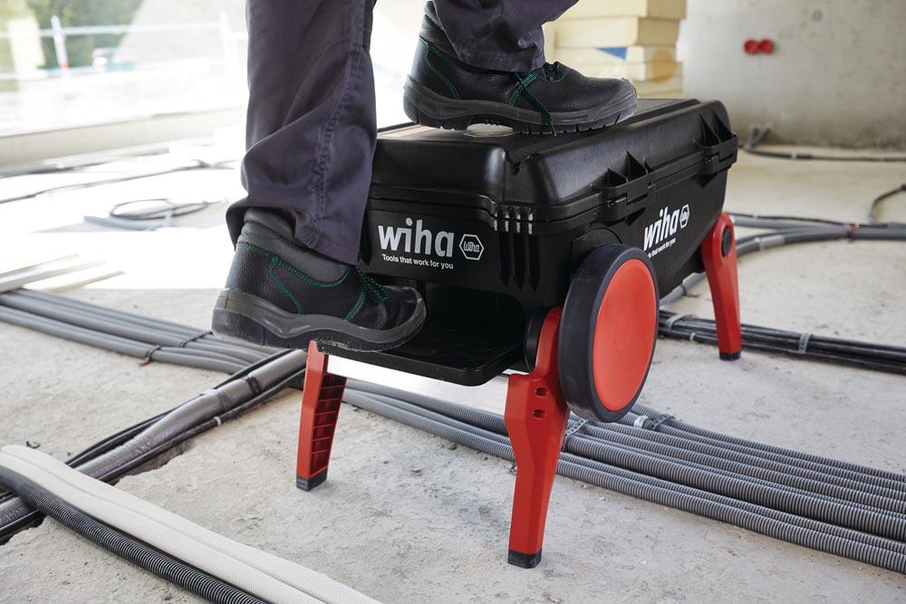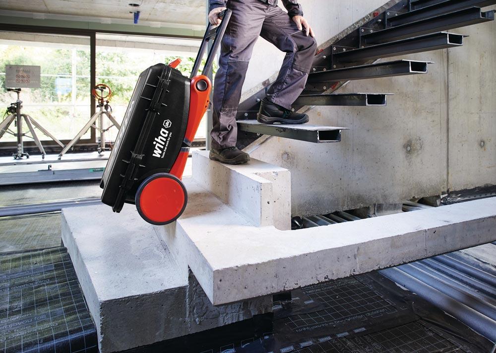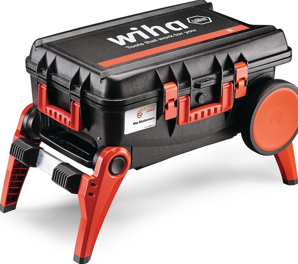 umfangreiches, praxisorientiertes Sortiment im robustem Schutzkoffer · integrierte Gasdruckdämpfer halten den bestückten Deckel in der gewünschten Position · Koffer staub- und wasserdicht mit Druckausgleichsventil · stapelbar, rollbar · mit integriertem Fahrgestell · ausklappbare Beine für eine erhöhte Entnahmeposition und einen stabilen rutschsicheren Tritt für hochgelegene Arbeiten · große Räder für komfortables rollen auf Treppenstufen und unwegsamen Gelände · V-förmige Kerbung im Deckel als Absägehilfe