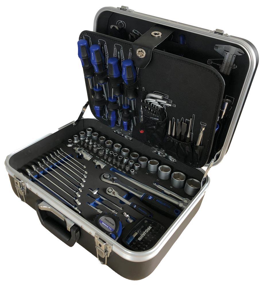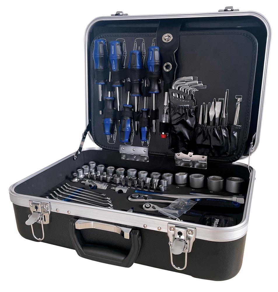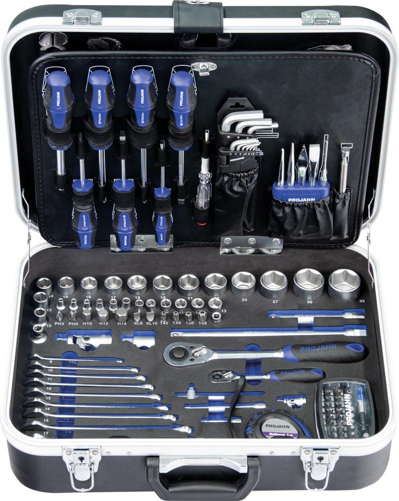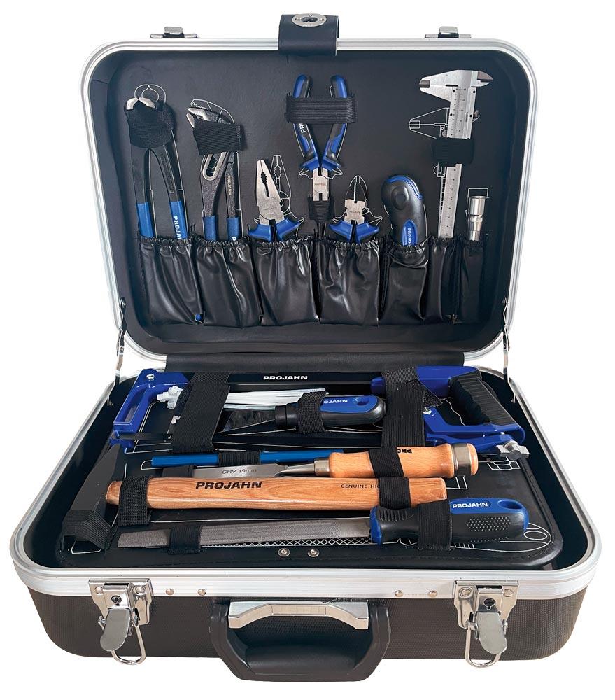 Ausführung: Umfangreiches "Profi-Werkzeug"-Sortiment in praxisgerechter Zusammenstellung ∙ Schalenkoffer aus schlagfestem ABS-Kunststoff mit gehärtetem Aluminiumrahmen ∙ Mit zwei doppelseitigen Werkzeugtafeln mit Einsteckschlaufen ∙ Zwei abschließbare Schlösser einschl. Schlüssel
