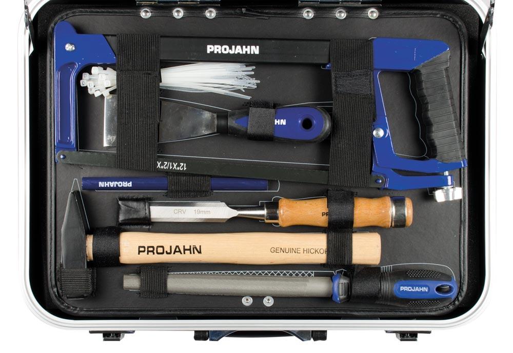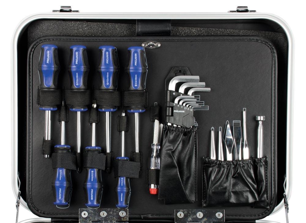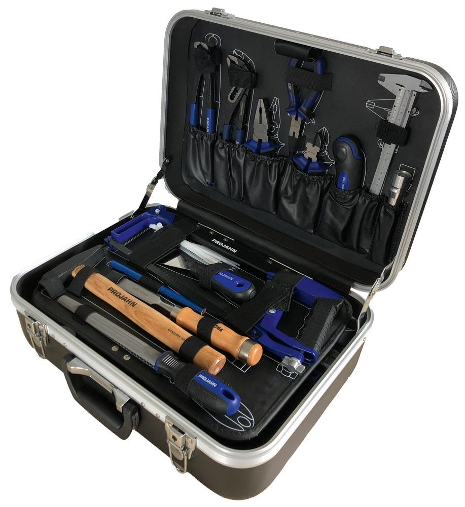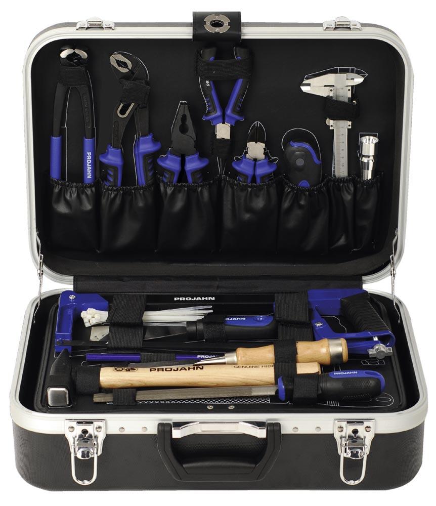 Ausführung: Umfangreiches "Profi-Werkzeug"-Sortiment in praxisgerechter Zusammenstellung ∙ Schalenkoffer aus schlagfestem ABS-Kunststoff mit gehärtetem Aluminiumrahmen ∙ Mit zwei doppelseitigen Werkzeugtafeln mit Einsteckschlaufen ∙ Zwei abschließbare Schlösser einschl. Schlüssel