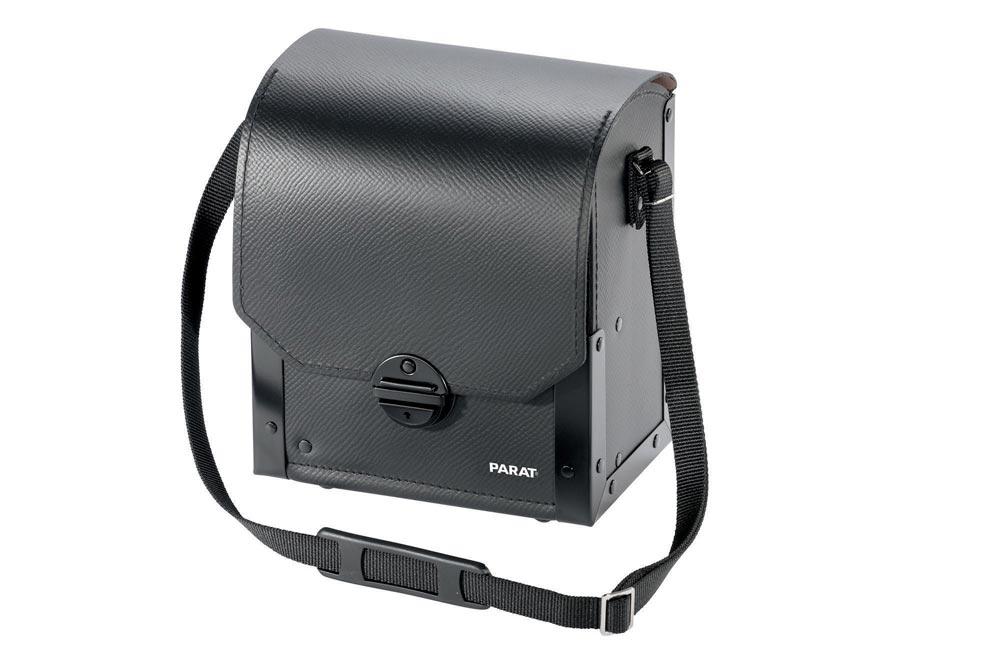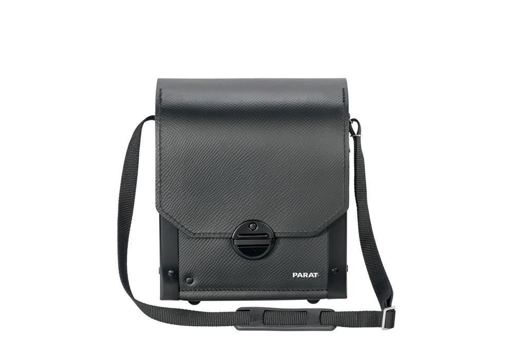 aus Rindsleder · schwarz · aluwinkelverstärkter Taschenkörper · Bodengleiter · Vorder-, Rück- und Mittelwand mit 17 Einsteckfächern · durchsichtiges Klemmfach im Deckel · Trageriemen · verstellbar · abschließbares Steckschloss