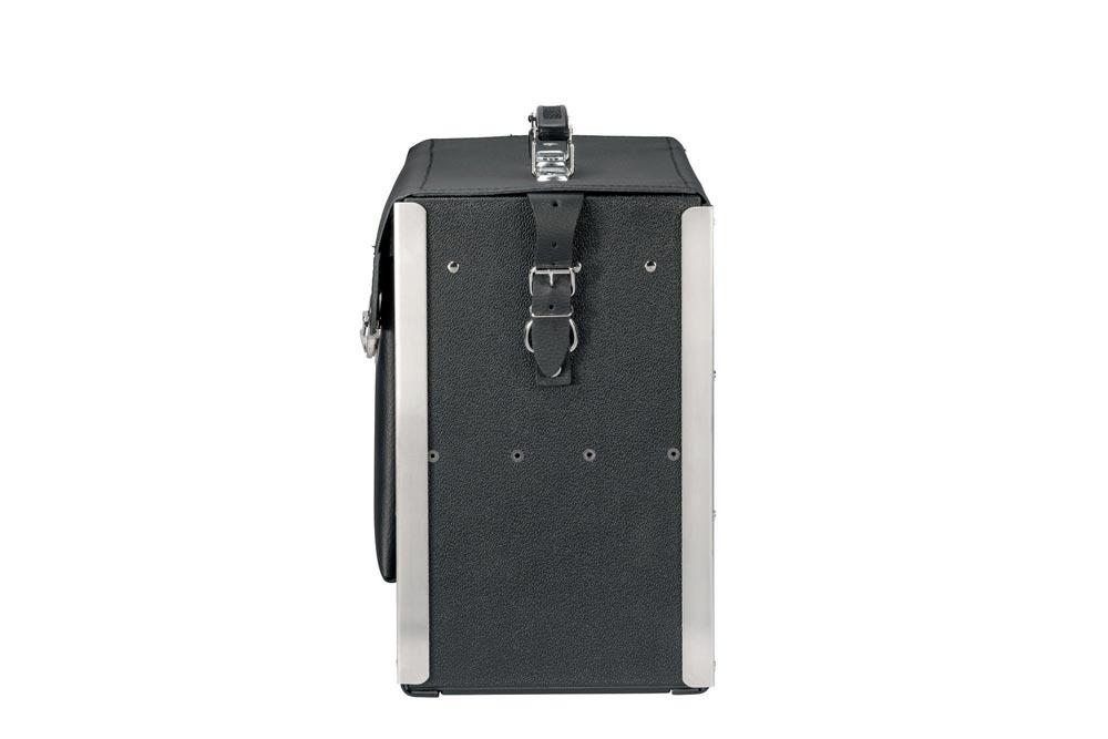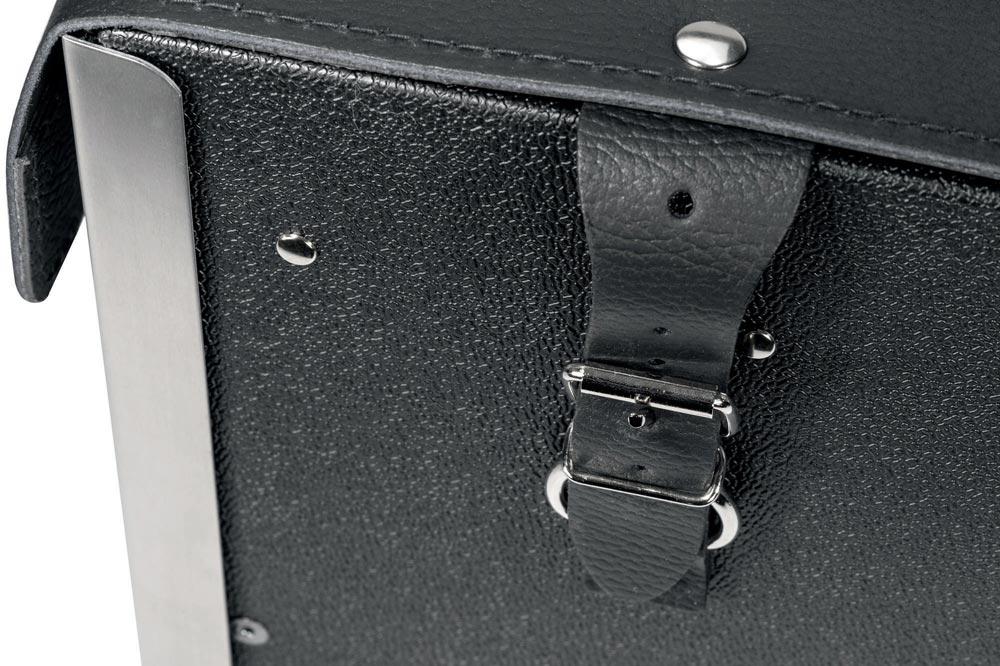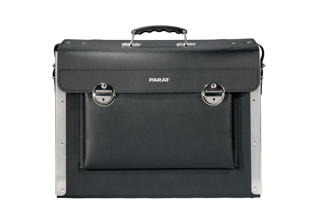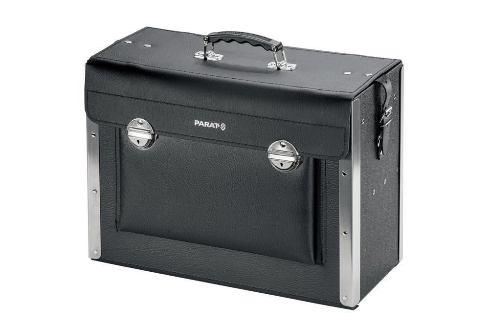 aus Rindsleder · schwarz · aluwinkelverstärkter Taschenkörper · Vorder- und Rückwand teilaufklappbar · mit 9 bzw. 11 festen Schlaufen · feste Mittelwand mit 19 festen Schlaufen · Seitenwände mit 4 Schlaufen · Halteschlaufe für Wasserwaage unter Griff · Vortasche · stabiler Griff · Bodenschale · abschließbare Parat-Steckschlösser · 2 Schließriemen · Ringkappen zur Befestigung eines Trageriemens (gehört nicht zum Lieferumfang)