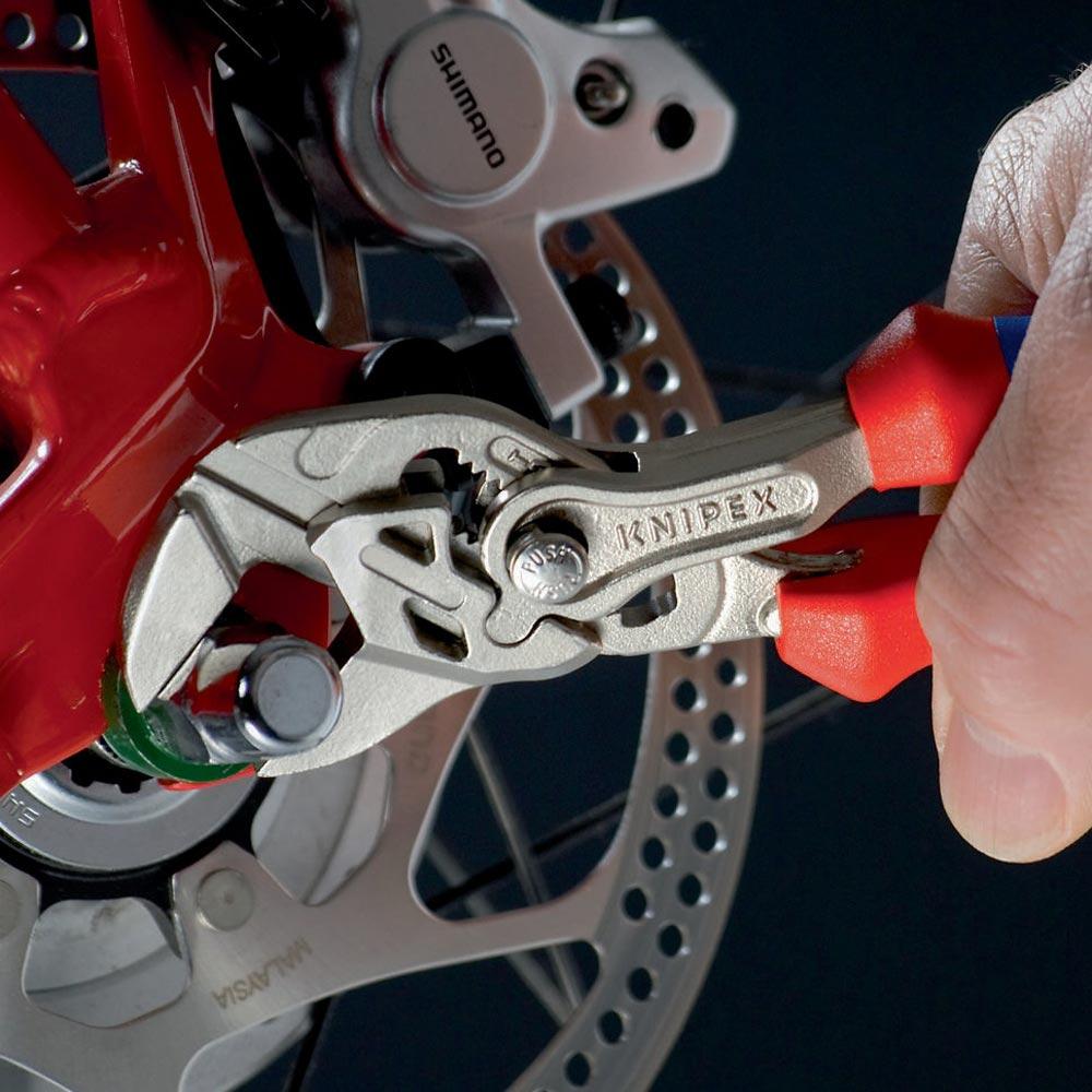 ersetzt einen Satz Schraubenschlüssel, metrisch wie zöllig · glatte Backen für die schonende Montage von oberflächenveredelten Armaturen · Arbeiten direkt auf Chrom · Schnellverstellung per Knopfdruck · Chrom-Vanadin-Elektrostahl, geschmiedet, ölgehärtet