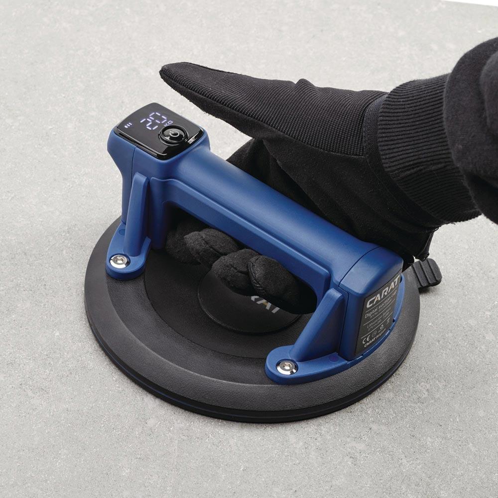 DIGITAL · Display zur Kontrolle des automatischen Betriebs · saugt automatisch bis zu 200 kg Tragfähigkeit an und stoppt dann automatisch · wenn der Druck auf 130 kg sinkt, schaltet sich die Vakuumpumpe automatisch wieder ein · Überwachung des Batteriestatus · integrierter Akku, aufladbar über USB und USB-C-Kabel im Lieferumfang enthalten · Lieferung in stabilem Koffer geliefert