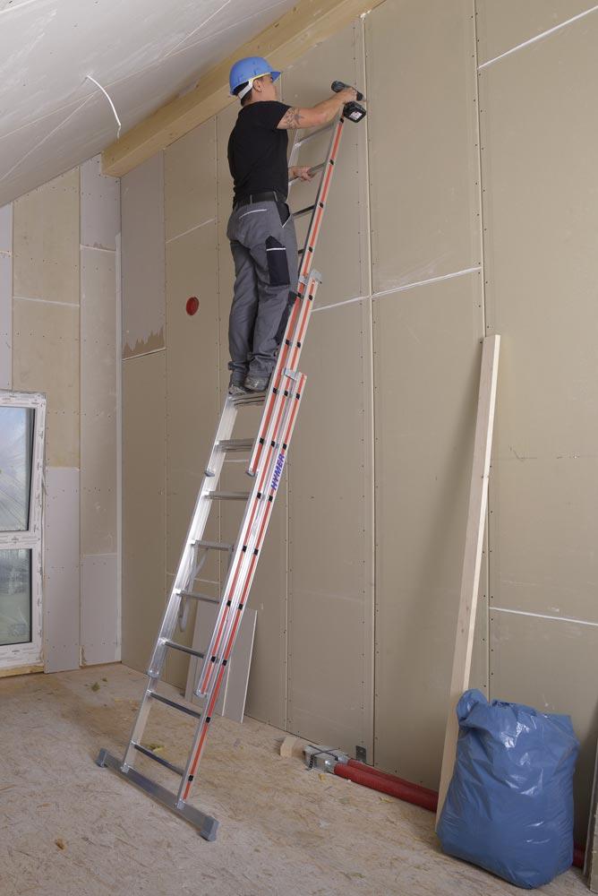 Produktinformationen "Mehrzweckleiter, 3-teilig, 3x7 Sprossen, Länge als Anlegeleiter 4870 mm, senkr. Höhe mit Steckteil 3290 mm, Perlongurte Gewicht 13,2 kg"