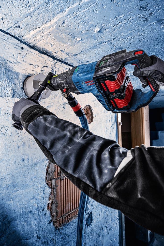 Akku-Diamantbohrmaschine mit BITURBO BRUSHLESS Technologie ∙ Zwei Libellen für vertikal und horizontal ausgerichtete Bohrungen ∙ Überlast-Anzeige zeigt die optimale Druckkraft basierend auf dem Stromverbrauch für eine optimierte Laufzeit an ∙ KickBack Control erkennt ein plötzliches Verklemmen/Verkanten und schaltet das Gerät sofort ab ∙ Staubabsaugadapter für Trockenbohren und Wasserversorgung für Nassbohren ∙ Kompatibel mit dem GCR 180 (II) Professional für den Betrieb im Bohrständer