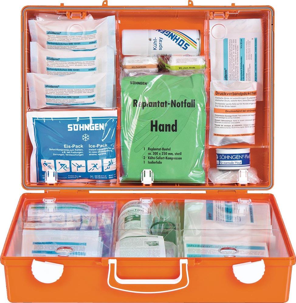 Zusatzinhalt: u.a. oculav NIT®-Augenspülung · Kühlspray · Splitterpinzette · WS-Idealbinden · erhöhter aluderm®-aluplast-Pflasteranteil · Spezial-Druckverbandpäckchen · aluderm®-Spezialverbände · Replantat klein für Hand