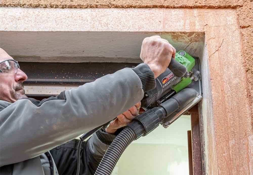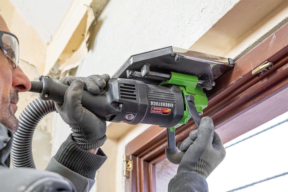 Leistungstarke Fenstersäge zur präzisen Demontage von Fenstern und Türen ∙ Eck- oder Längsschnitte durch werkzeuglos um 180° drehbares Bodenblech ∙ Stufenlose Einstellung der Schnitttiefe mittels stufenlosen Schnitttiefenbegrenzer ∙ Absaustutzen Ø 35mm für den Direktanschluss eines Saugers