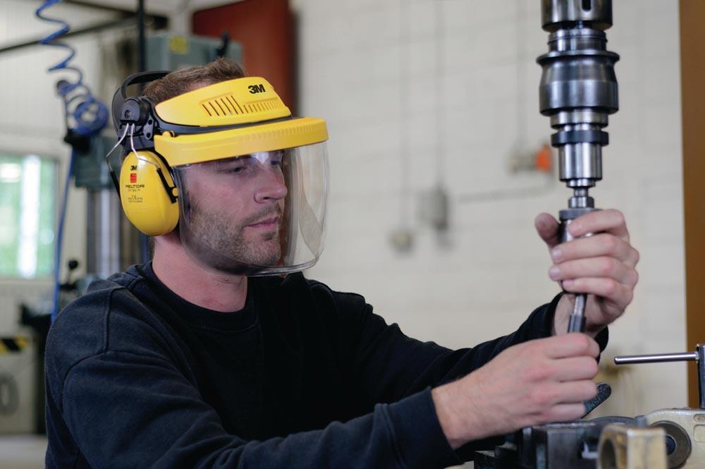 für Industrie und Baugewerbe · bestehend aus: Kopfband mit Ratschensystem zur schnellen und präzisen Größeneinstellung (zwischen den Größen 54 cm und 62 cm einstellbar), klappbarem Klarsichtvisier aus Polycarbonat (5F-11) – bietet Schutz vor schnellfliegenden Partikeln (120 m/s) nach EN 166, Kapselgehörschutz OPTIME I (H510P3E)