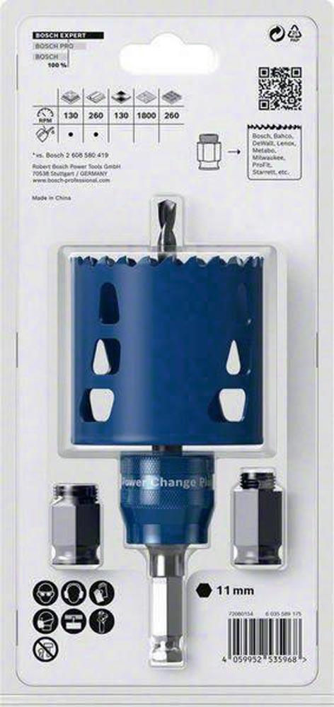 lange Lebensdauer beim Schneiden von Löchern in verschiedenen Materialen · mit Bosch Carbide Technology · perfekte Schnittform · ideal für schwere Aufgaben · einsatzbar in Holz, Metall, Edelstahl, Ziegelstein, weiche Fliesen und verstärkte Kunststoffe · zur Verwendung mit dem Power Change Plus-Schnellspann-Adapter