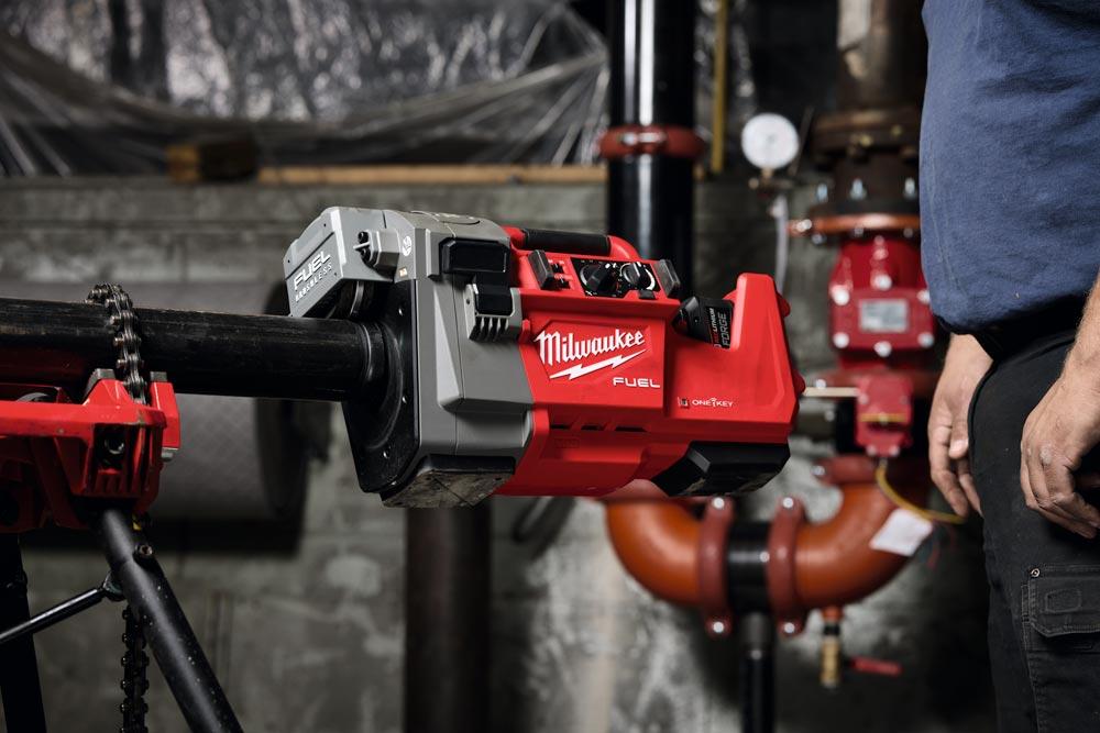 Leistungsstarke Rollnutmaschine mit einer Einstechkapazität von 1 ¼„ (DN32) - 4“ (DN100) in verschiedenen Wandstärken ∙ Laufzeit von bis zu 50 Nuten auf 2,5“ Rohren pro M18™ 8,0 Ah Akku ∙ Freihändiger Betrieb, das Werkzeug dreht sich selbsttätig um das Rohr