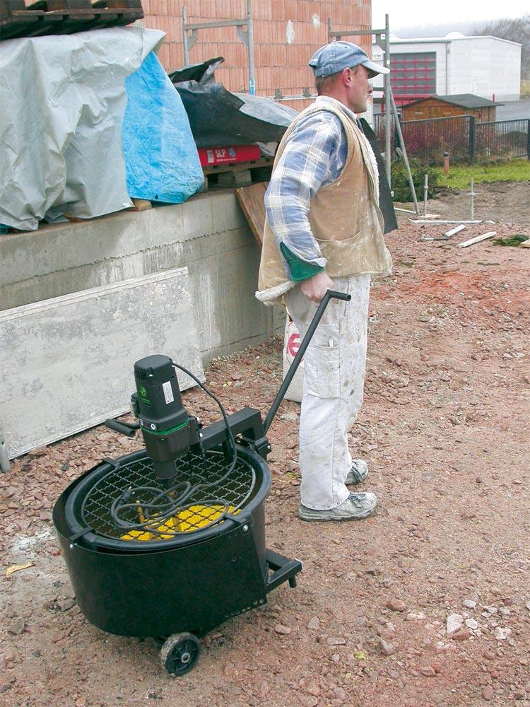 Mischstation mit durchzugsstarkem Universalmotor ∙ IntegriertesTransportgestell mit Zugstange für den mobulen Einsatz ∙ Schalter mit Staubschutz und mechanische Sicherheitskupplung ∙ Werkzeugloses Trennen von Motor und Untergestell für einachen Transport und platzsparende Aufbewahrung ∙ Mit Schutzgitter zum einfachen, sicheren Entleeren von Sackware ∙ Ausklappbarer Maschinenarm für einfachen Behälterwechsel ∙ Standsicher durch Verdrehschutz für Mischkübel