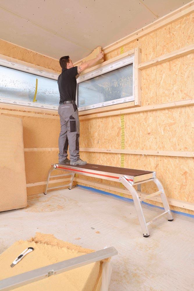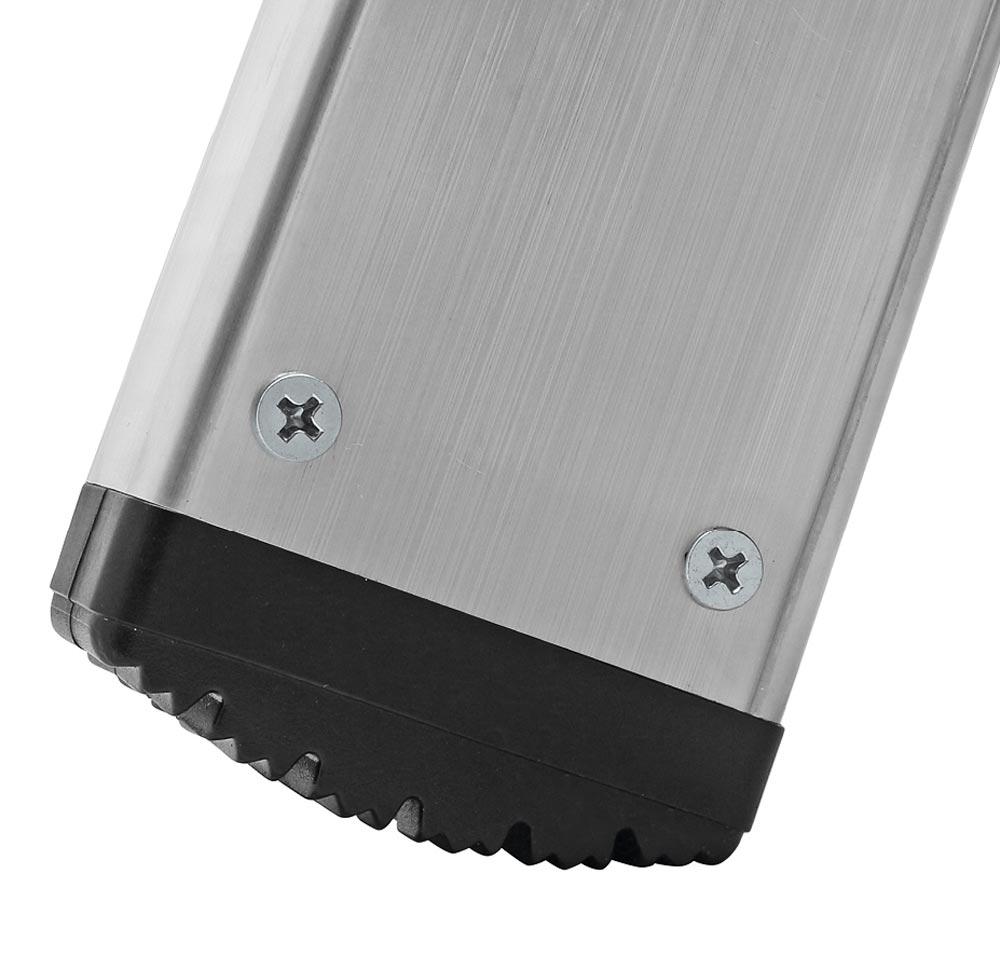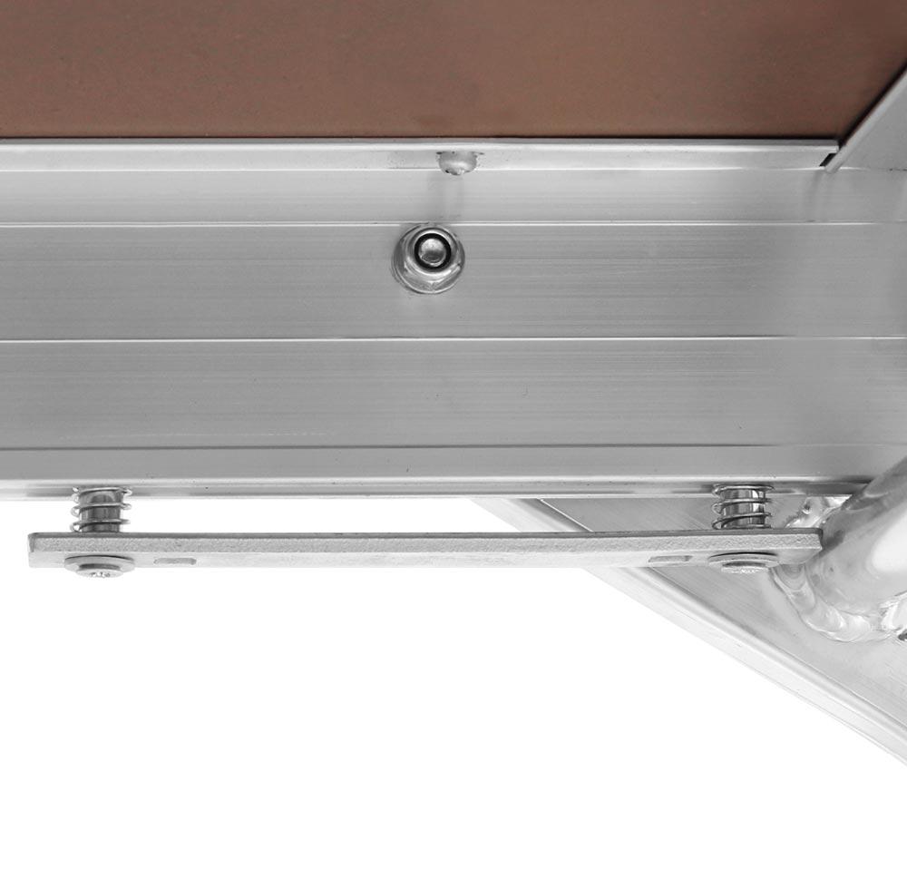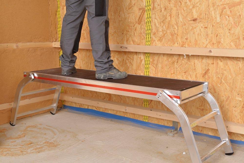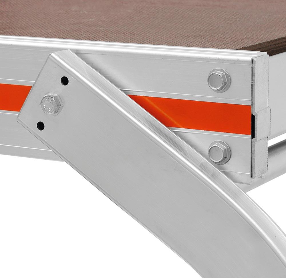 ∙ Hohe Standsicherheit ∙ Automatisches Einrasten der Stützen in Gebrauch- und Transportstellung ∙ Griffloch in der Belagfläche für leichten Transport ∙ Zulässige Belastung bis max. 300 kg bei gleichmäßig verteilter Last ∙ Leiterfüße sind mit dem Holm verschraubt, leicht auswechselbar · Platzsparendes Lagern und Transportieren