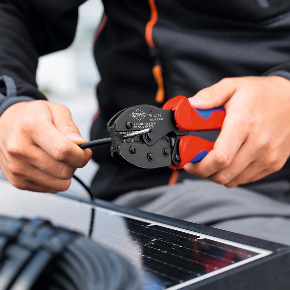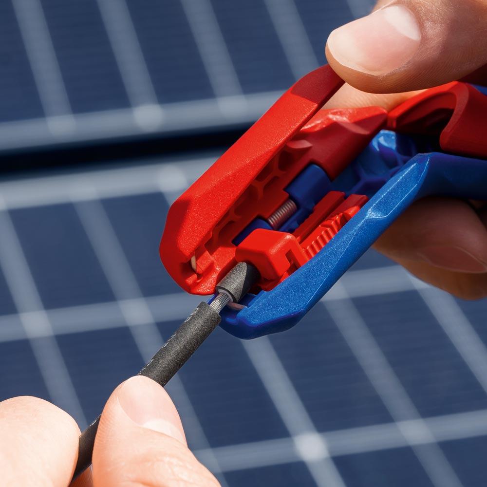 Für Installation und Wartung von PV-Anlagen ∙ KNIPEX ErgoStrip® PV zum schnellen und präzisen Abisolieren von Solarkabeln mit 4 und 6 mm² und zum Abmanteln und Abisolieren aller gängigen Rund- und Feuchtraumkabel ∙ KNIPEX PreciForce® verpresst PV-Leiter (4 und 6 mm²) mit MC4®- und MC4® EVO 2-Verbindern