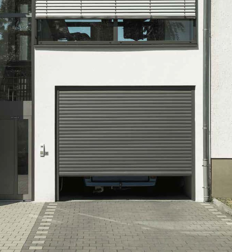 ROMA Rolltor inklusive Ballenkasten. Dieses Tor kann hinter und in die Mauerleibung, sowie als Außenroller montiert werden. Das Torblatt besteht aus doppelwandigen und isolierten Aluminiumlamellen (19 mm), die in verschiedenen Standardfarben erhältlich sind.
