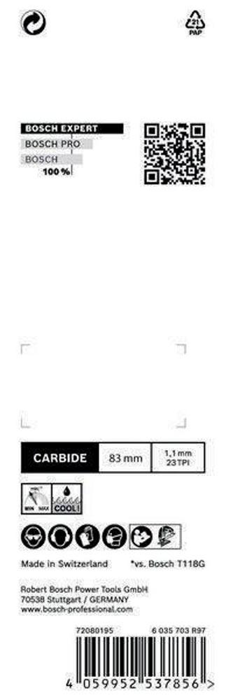langlebiges Schneiden von Edelstahlblech · herausragende Lebensdauer durch die Bosch Carbide-Technologie · dabei wird eine Zahnleiste aus dem härtesten Metall auf den Körper lasergeschweißt · passend für alle T-Schaft-Stichsägen