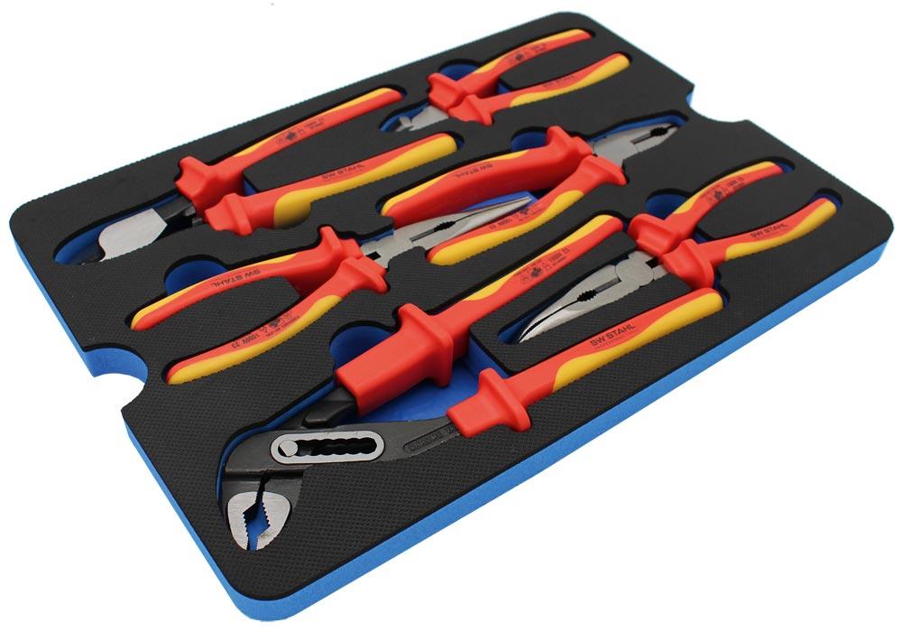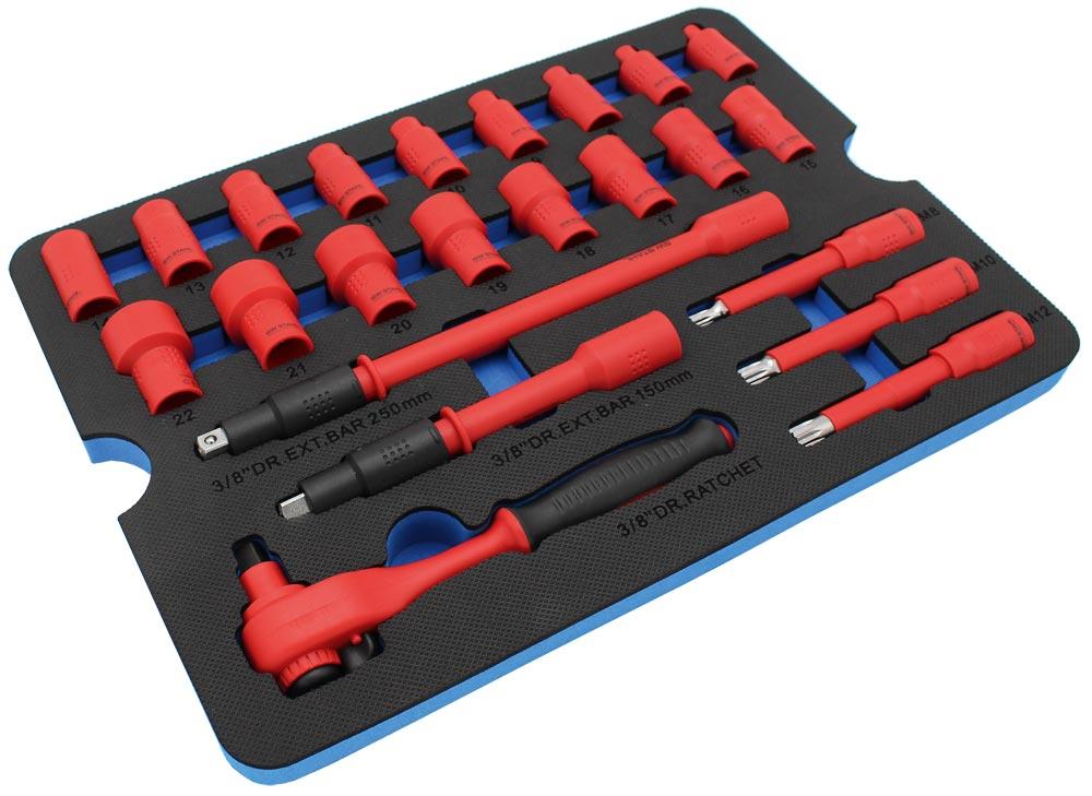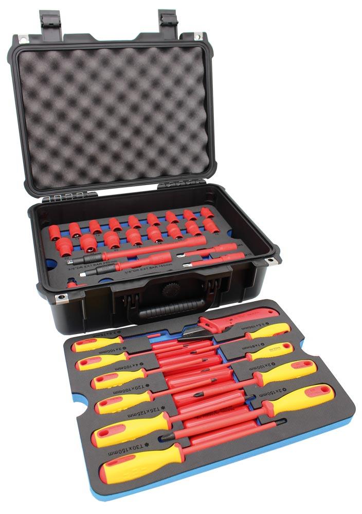 Lieferumfang: Isolierte Schraubendreher in folgenden Größen: PH1, PH2, PH3, T20, T25, T30, 2,5 - 3 - 3,5 - 4 mm ∙ Isolierte 10 mm (3/8") Steckschlüsseleinsätze in folgenden Größen: 6 - 7 - 8 - 9 - 10 - 11 - 12 - 13 - 14 - 15 - 16 - 17 - 18 - 19 - 20 - 21 - 22 mm ∙ Isolierte 10 mm (3/8") Schraubendreheinsätze in folgenden Größen: M8, M10, M12 ∙ Isolierte 10 mm (3/8") Verlängerungen in folgenden Größen: 150 und 250 mm ∙ Abisoliermesser Isolierte Wasserpumpenzange, 250 mm ∙ Isolierte Flachrundzange, gerade, 200 mm ∙ Isolierte Flachrundzange, gebogen, 200 mm ∙ Isolierte Kabelschere Isolierte Kombizange, 180 mm ∙ Isolierter Kraftseitenschneider, 160 mm ∙ 10 Isolierkappen Isolierte Knarre, 10 mm (3/8") im Kunststoffkoffer
