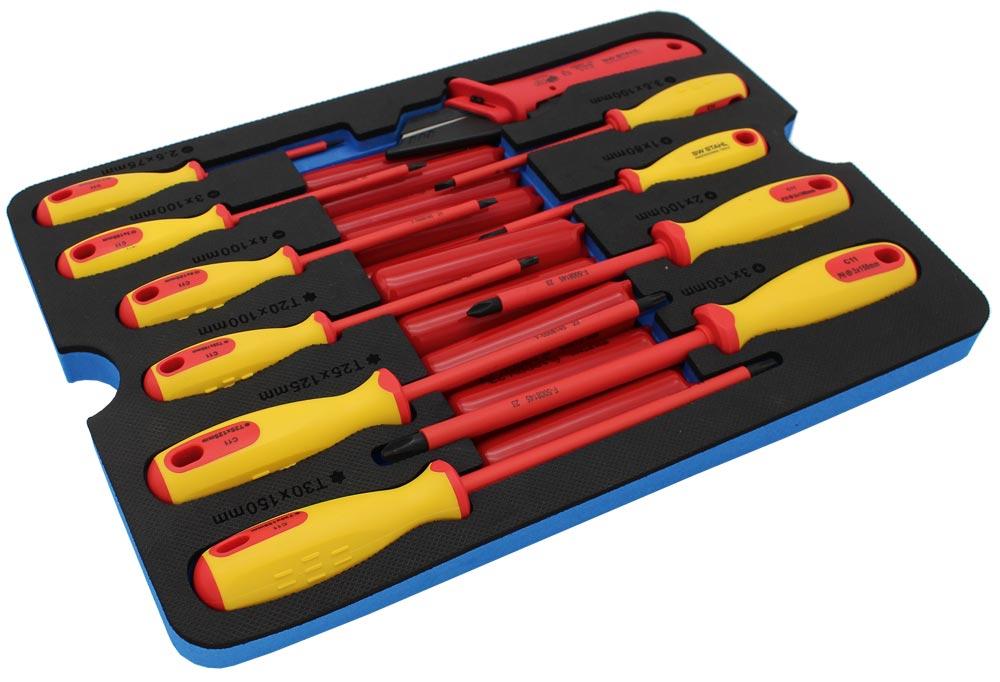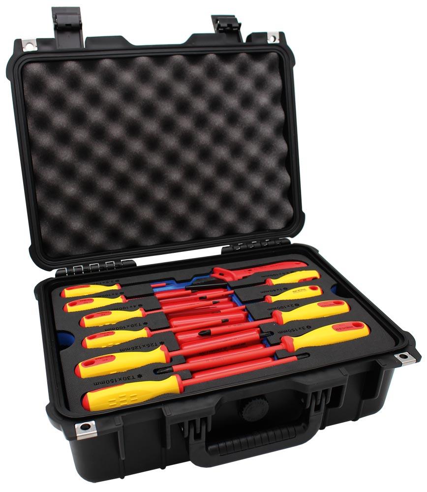Enthält alle wichtigen Werkzeuge, die das Arbeiten an Elektrofahrzeugen, stromführende Leitungen oder sonstigen elektrischen Gegenständen ermöglichen ∙ Alle Bestandteile des Satzes sind nach der Norm DIN EN 60900 VDE 0682-201:2013-04 zertifiziert und somit bis 1.000 Volt Wechselspannung oder 1.500 Volt Gleichspannung isoliert